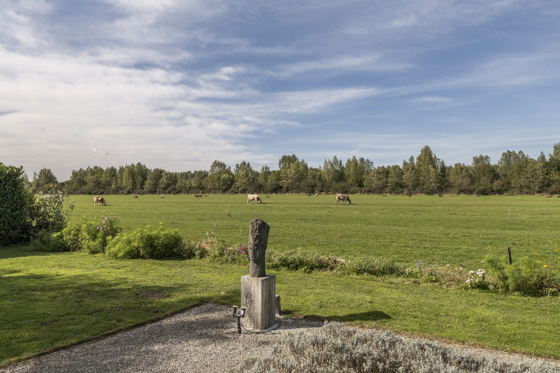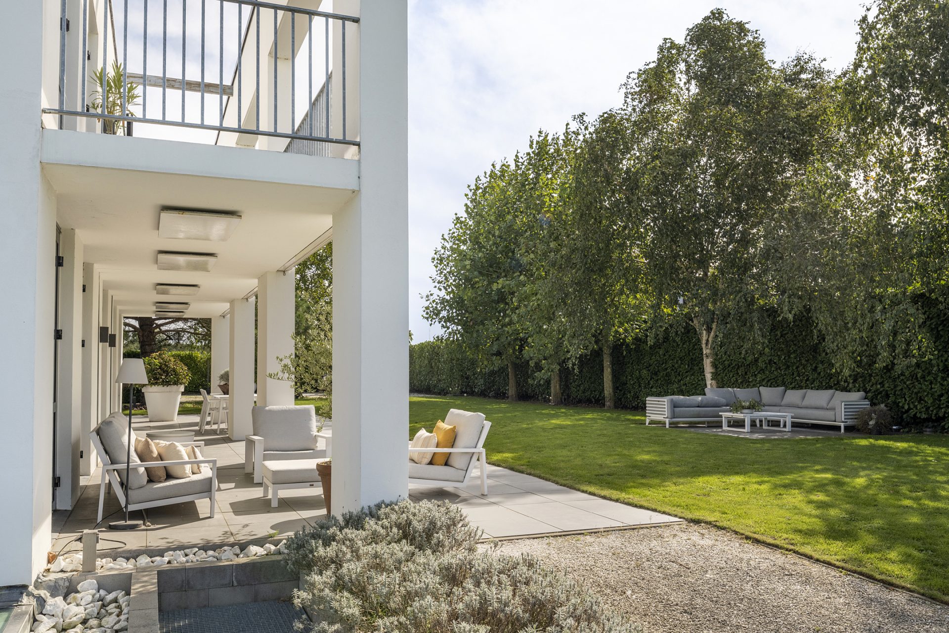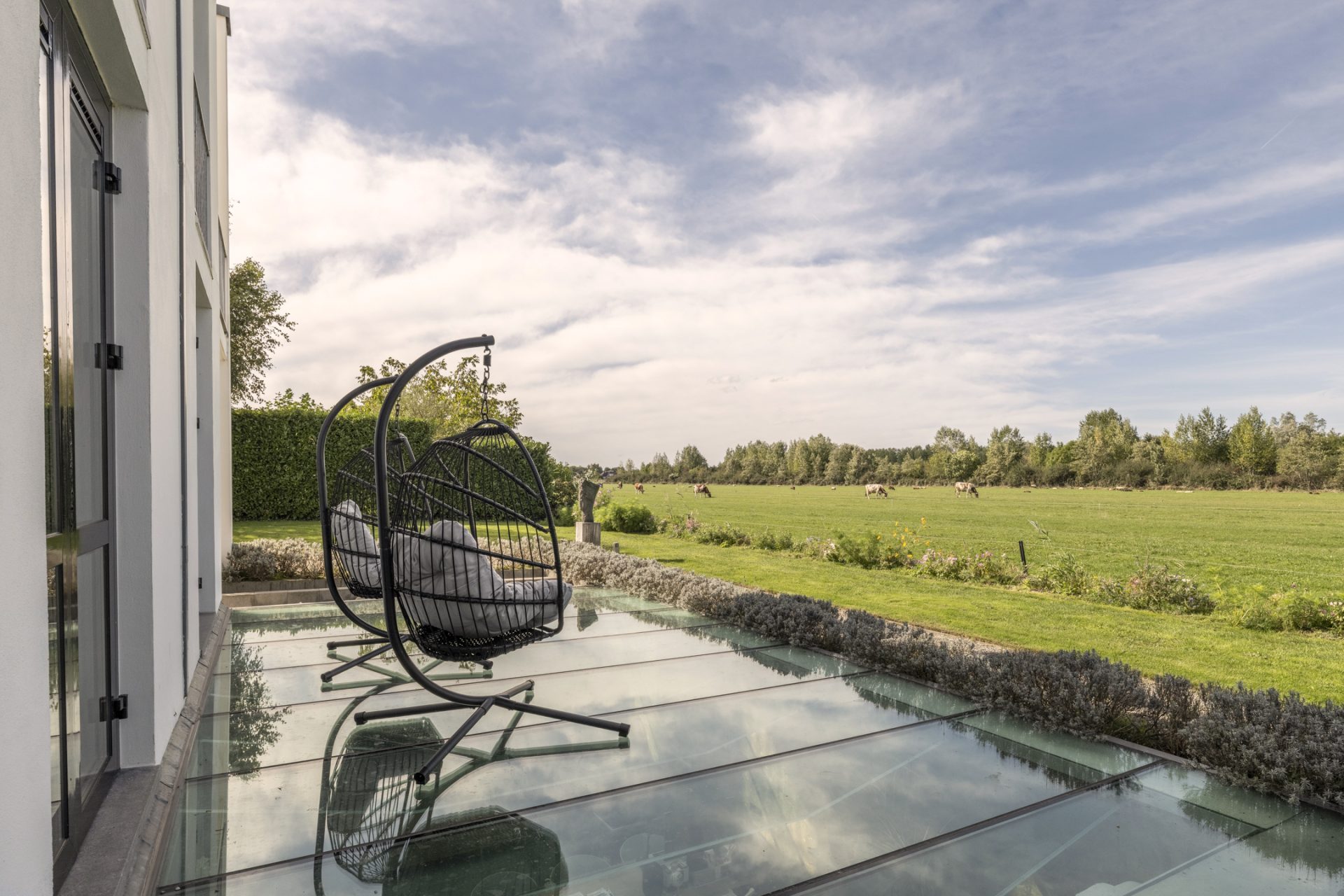 Rondom de woning ligt een prachtig aangelegde tuin die perfect aansluit op het omliggende landschap. De hoge hagen zorgen voor optimale privacy, terwijl het verzorgde gazon en de natuurlijke beplanting een rustige eenheid vormen met de omgeving. Aan de achterzijde geniet u van het vrije uitzicht over de weilanden. Aan de linkerzijde bevindt zich een royaal, overdekt terras – een ideale plek om te ontspannen en te genieten van de zon en stilte.