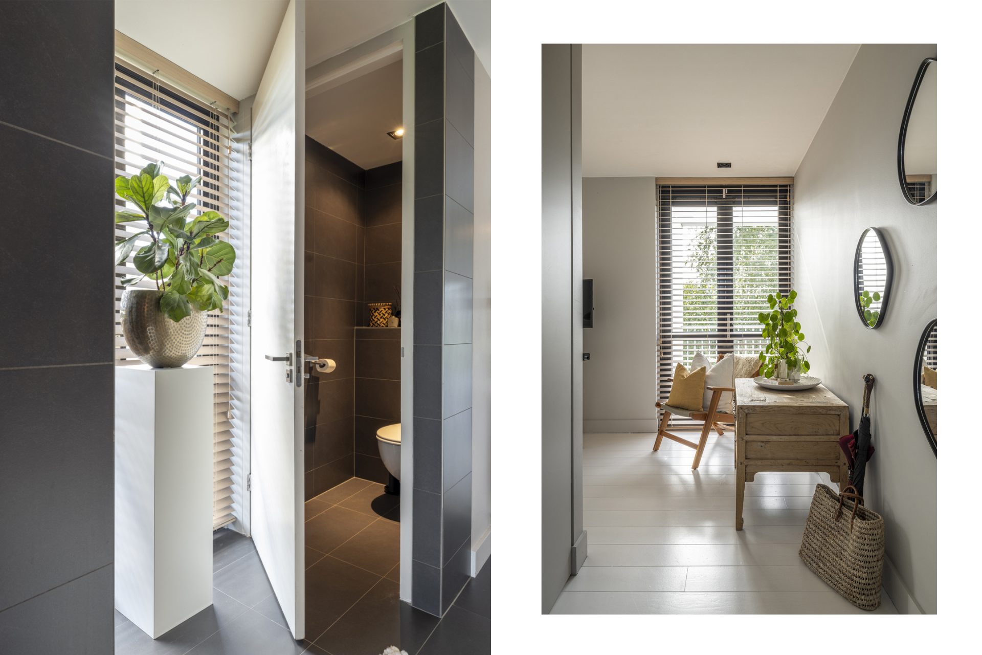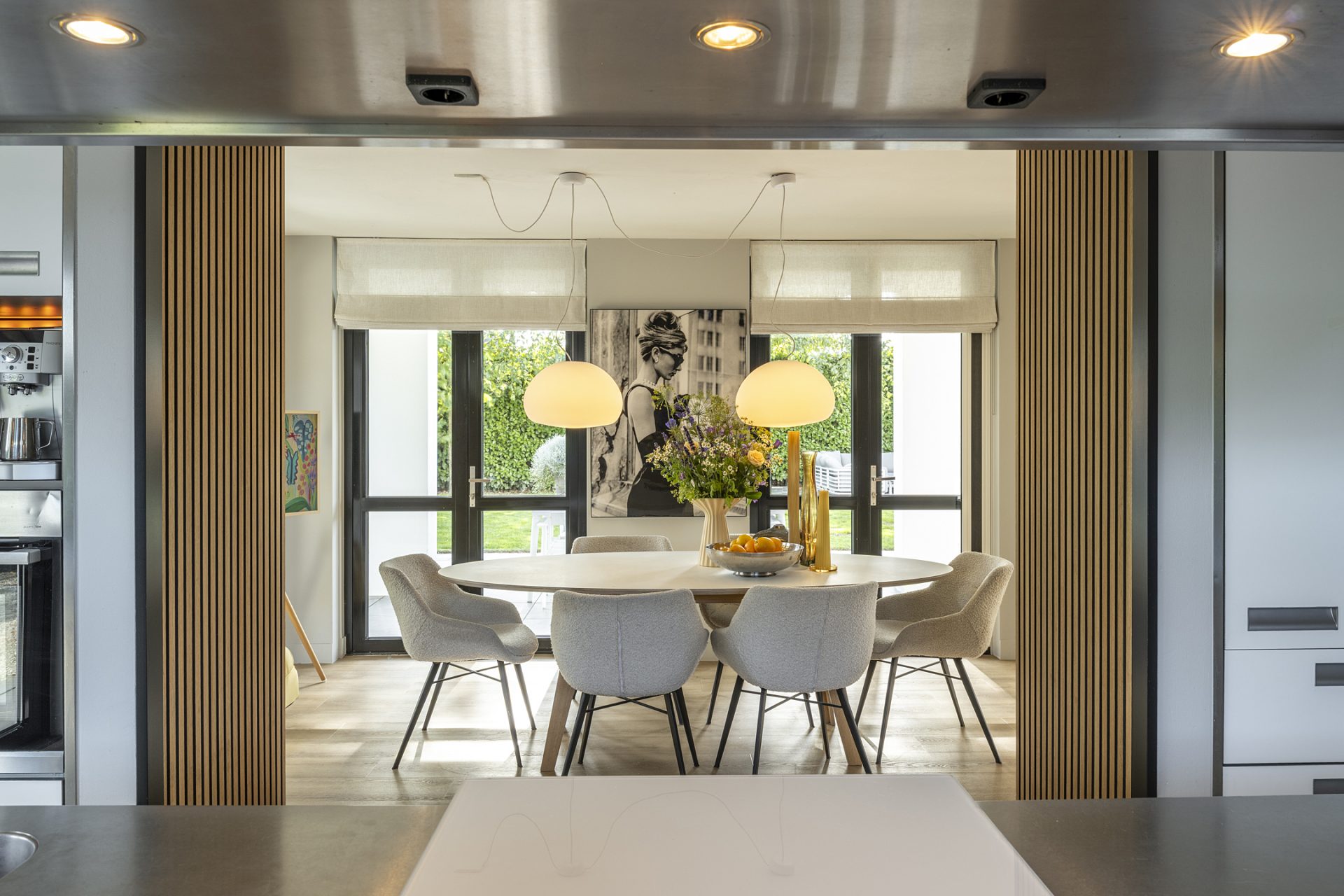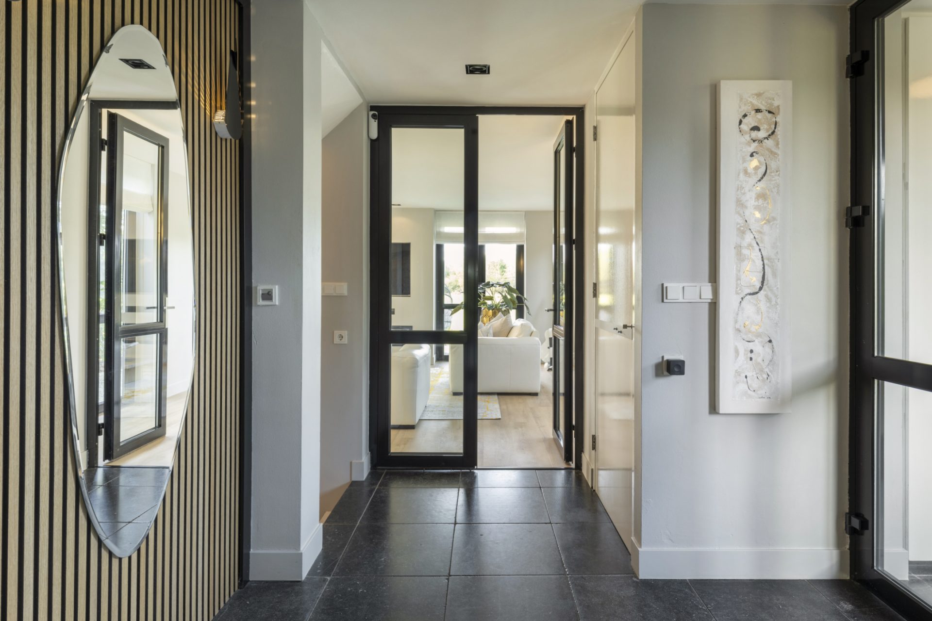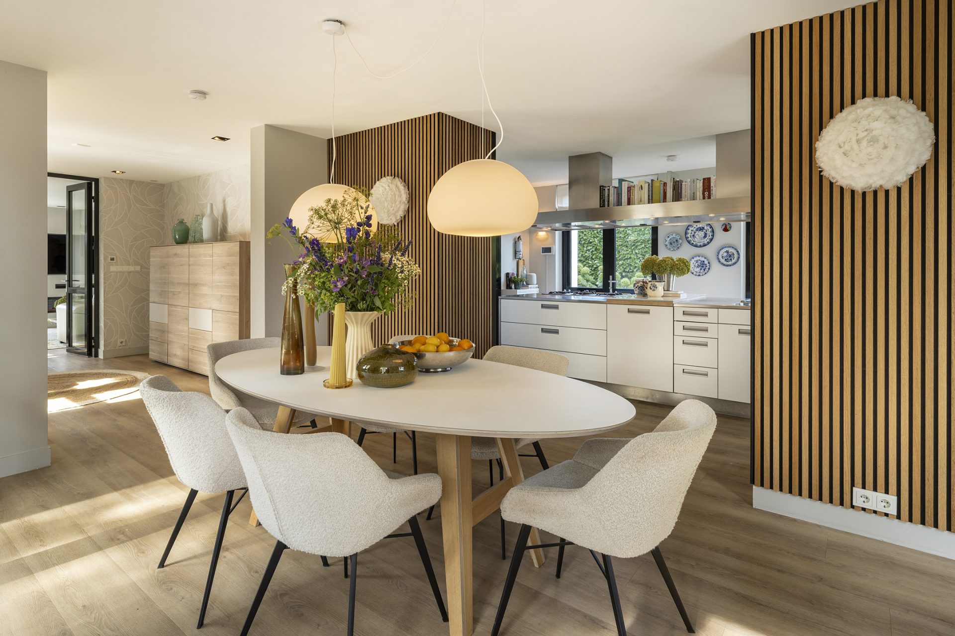 Aan de rechterzijde van de woning bevindt zich de ruime entree. Via een stijlvolle glazen deur komt u binnen in de hal met handige inbouwkasten, meterkast en toegang tot de woonkamer, open keuken, souterrain en verdieping. De living (ca. 57 m²) is L-vormig en biedt volop licht en uitzicht dankzij de vele openslaande deuren rondom. De zithoek aan de achterzijde heeft een sfeervolle haard en de vloer is voorzien van een moderne houtlook pvc-vloer. Houten wandpanelen geven het geheel een warme, chique uitstraling. Aan de voorzijde ligt de open keuken met eethoek. De keuken is ruim opgezet en uitgerust met een kookeiland, veel kastruimte en inbouwapparatuur. Via de woonkamer is tevens een afsluitbare zitkamer bereikbaar met openslaande deuren naar het overdekte terras — een ideale plek voor gezellige diners of ontspanning.