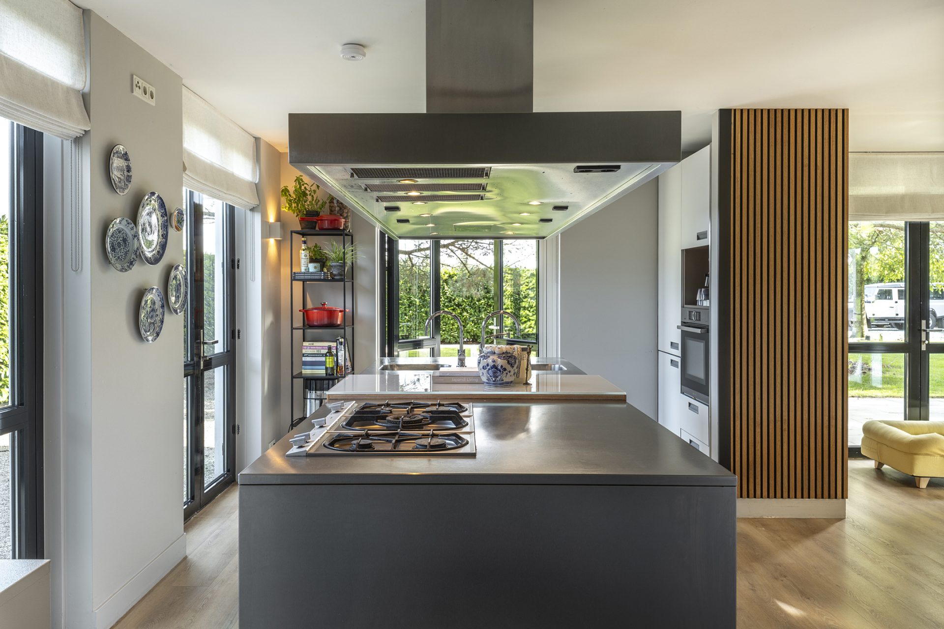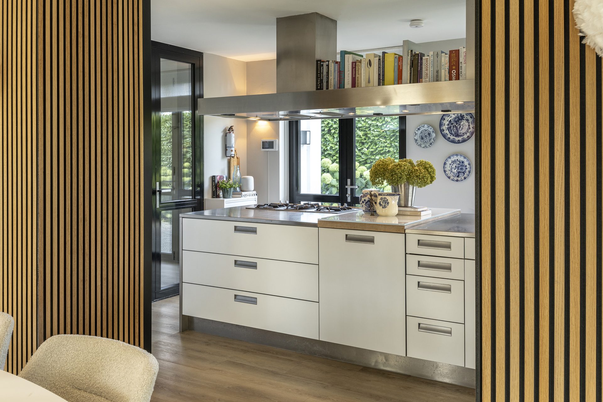 – Keukenapparatuur: gasfornuis, afzuigkap, combi-oven/magnetron, koelkast, vriezer, koel-vriescombinatie, vaatwasser en Quooker