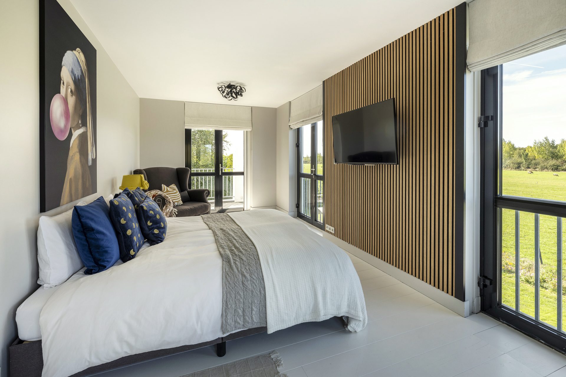 De twee slaapkamers aan de voorzijde beschikken over openslaande deuren met een Franse balkon. De houten vloer geeft de kamers een warme sfeer en het uitzicht over de weilanden is werkelijk schitterend.