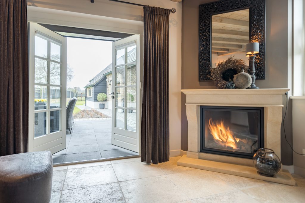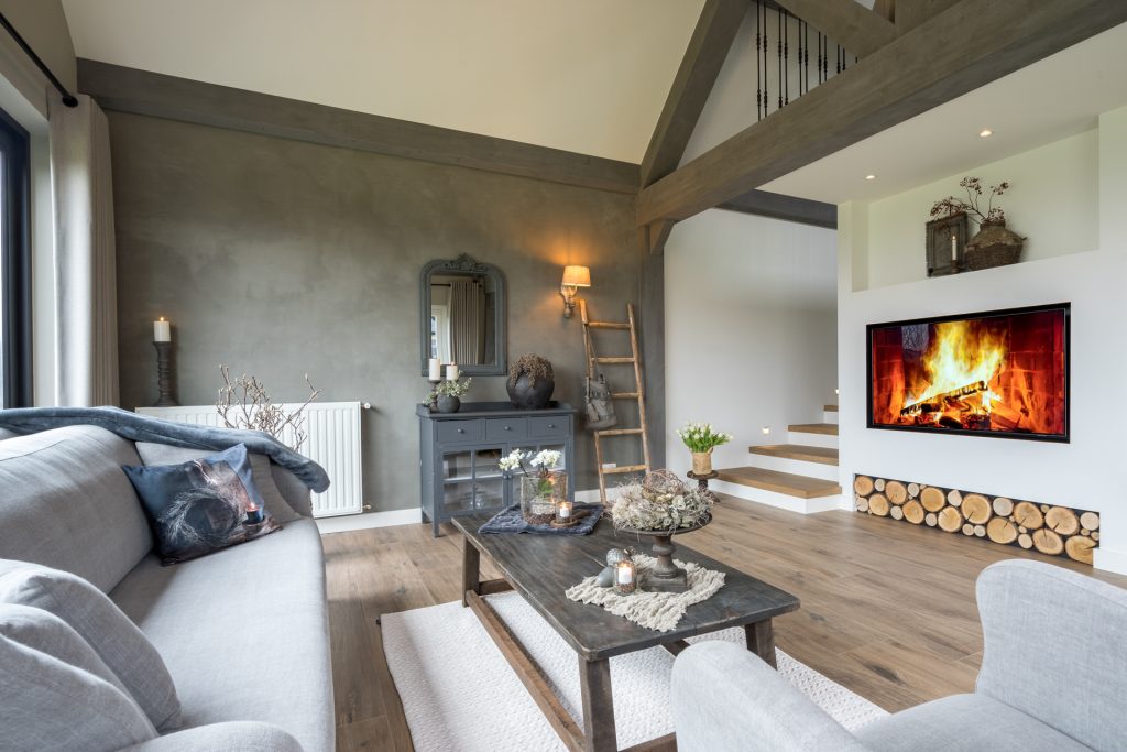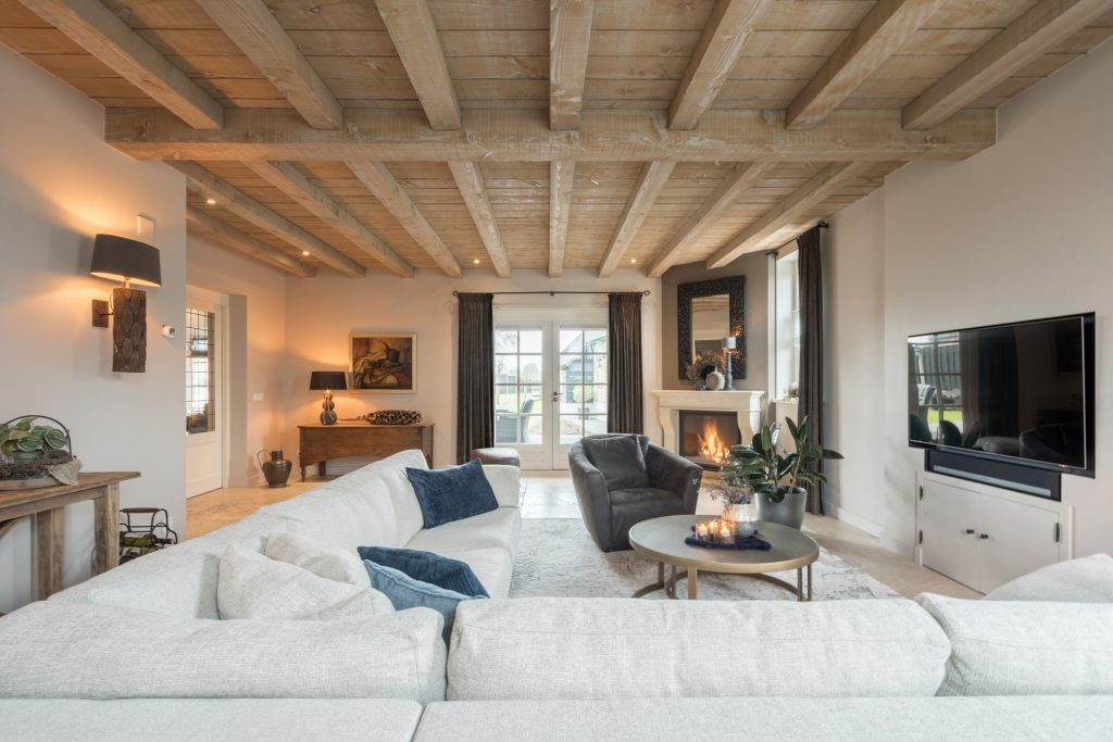 U komt binnen in de woonkamer. De sfeervolle woonkamer is voorzien van een prachtige natuurstenen vloer met vloerverwarming, stucwerk wanden en een houten plafond met balken. De royale living heeft voldoende ruimte voor een ruime zithoek. De aanwezige gashaard geeft een knus en intiem gevoel in deze ruimte. De openslaande deuren geven u toegang tot het terras in de achtertuin. Verder treft u in de woonkamer een praktische trapkast.