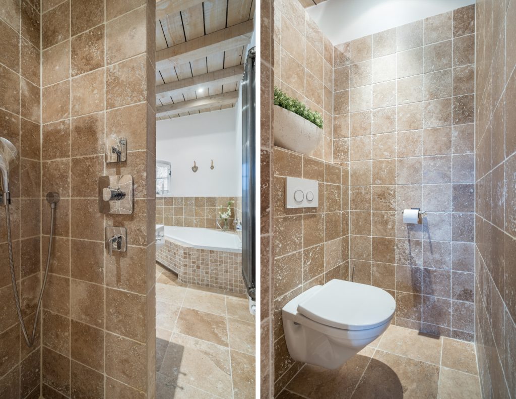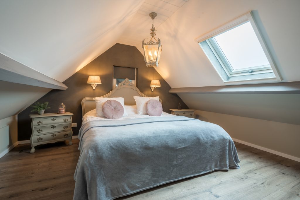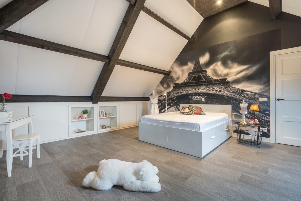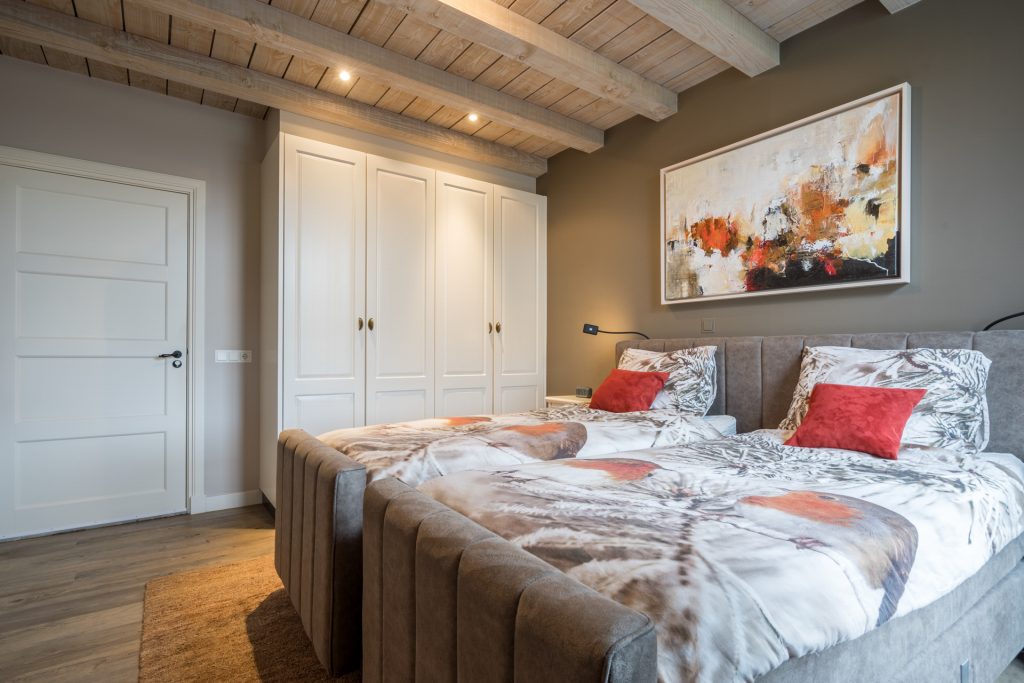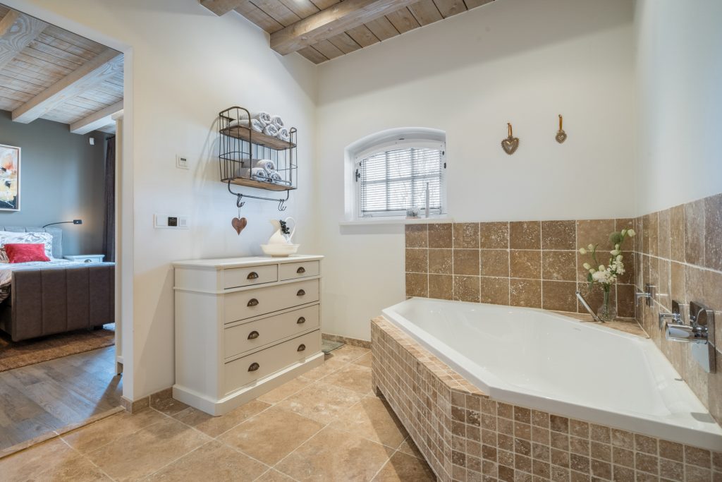 Aan de keuken grenst de riante ouderslaapkamer met badkamer en-suite. De slaapkamer is voorzien van een mooie PVC vloer en afgewerkt met stucwerk wanden en een houten plafond met balken. De kamer is verder uitgerust met een praktische kastenwand en biedt direct toegang tot de naastgelegen badkamer en-suite. De luxueuze badkamer is voorzien van een tegelvloer met vloerverwarming, een brede wastafel, hoek ligbad, geheel betegelde inloopdouche met regendouche, zwevend closet, designradiator, mechanische ventilatie en een te openen raam voor de natuurlijke ventilatie.
