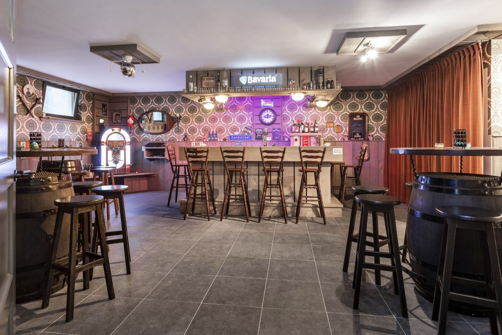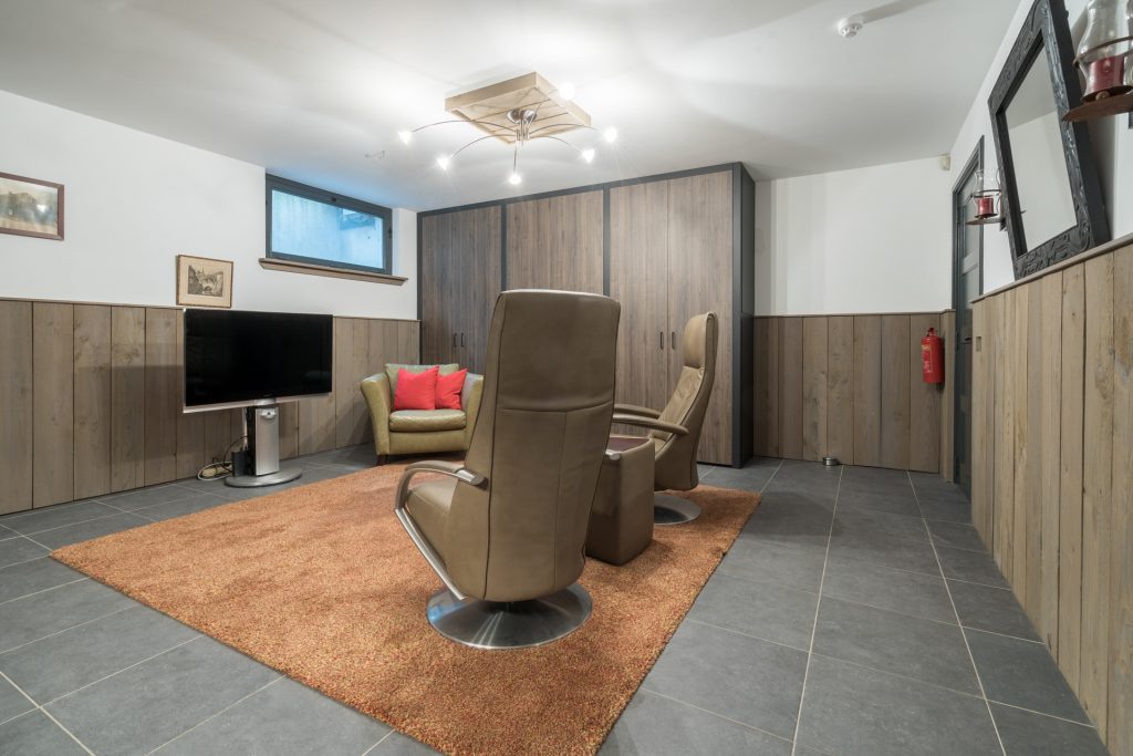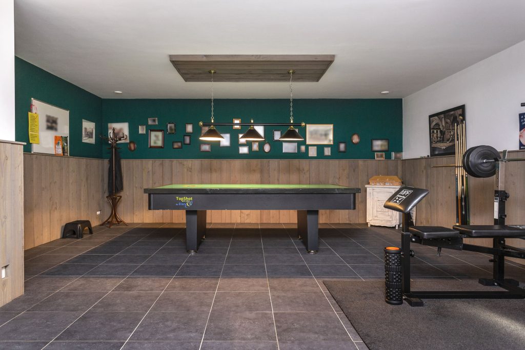 De kelder heeft een separate ruimte, die kan dienen als werkplek voor uzelf en/of speelruimte voor uw kinderen. Er is een poolbiljart aanwezig, welke ook te gebruiken is als tennistafel. De ruimte is voorzien van een op maat gemaakte kastenwand en verder uitstekend afgewerkt met stucwerk plafond, wanden en een tegelvloer met vloerverwarming. Er bevindt zich hier tevens een toiletruimte. Aansluitend komt u in een gezellige compleet uitgeruste bar met tegelvloer en vloerverwarming. Daarnaast treft u hier de centrale stofzuiginstallatie voor de gehele woning, c.v.-ketel en mechanische ventilatie.