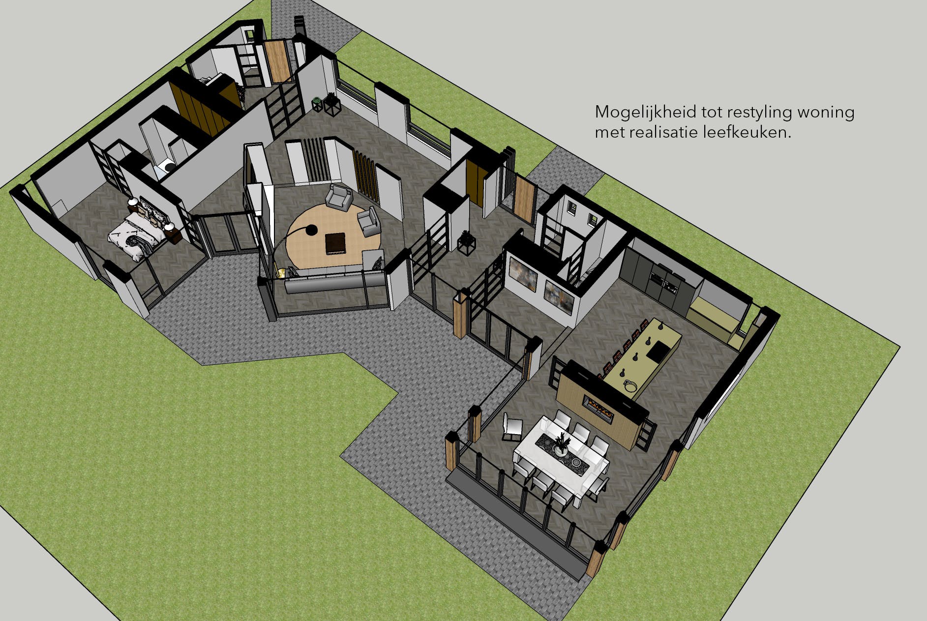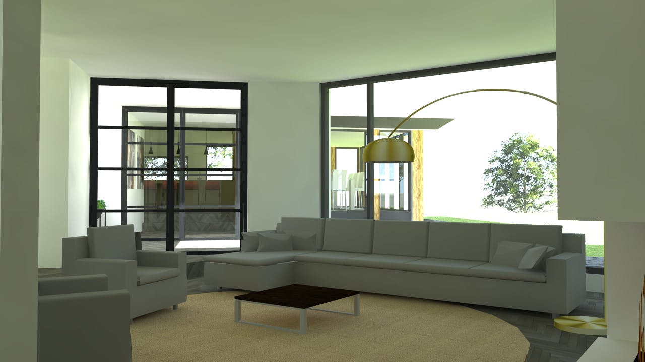 Om u een beeld te geven van de mogelijkheden tot het creëren van een leefkeuken waarbij de diepte van het perceel optimaal bij de woning wordt betrokken, hebben wij enkele impressies toegevoegd.