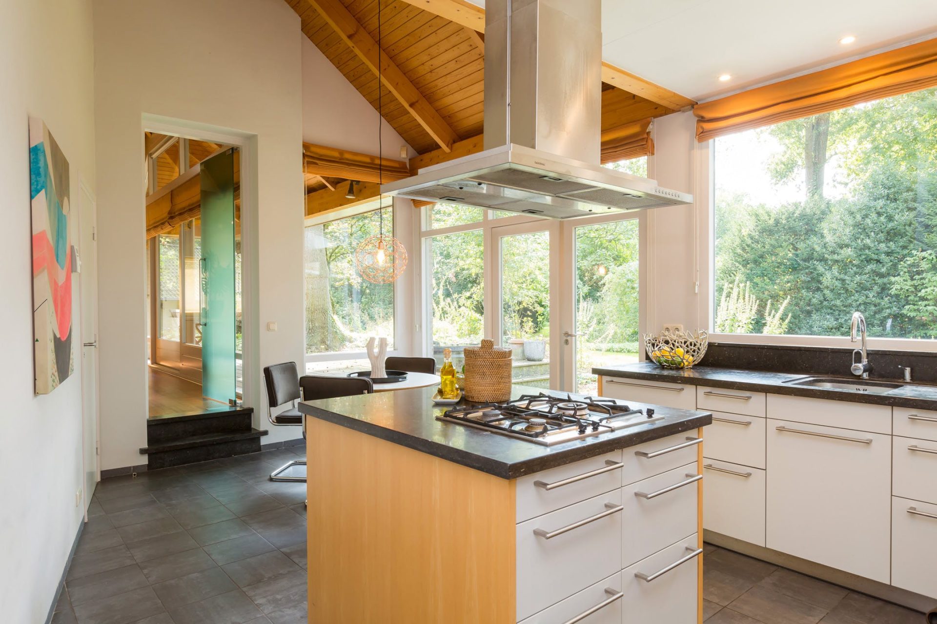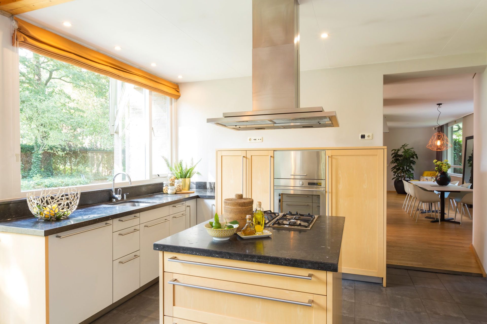 • Keuken met keukeninstallatie in L-opstelling en kookeiland;